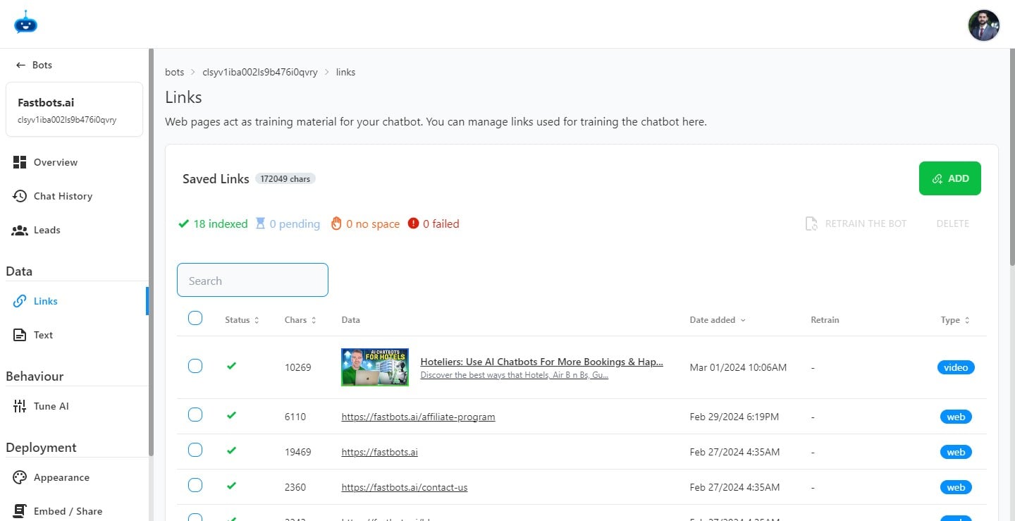 Once you see this tick mark under the status column, it means the YouTube video has been successfully added to the chatbot.