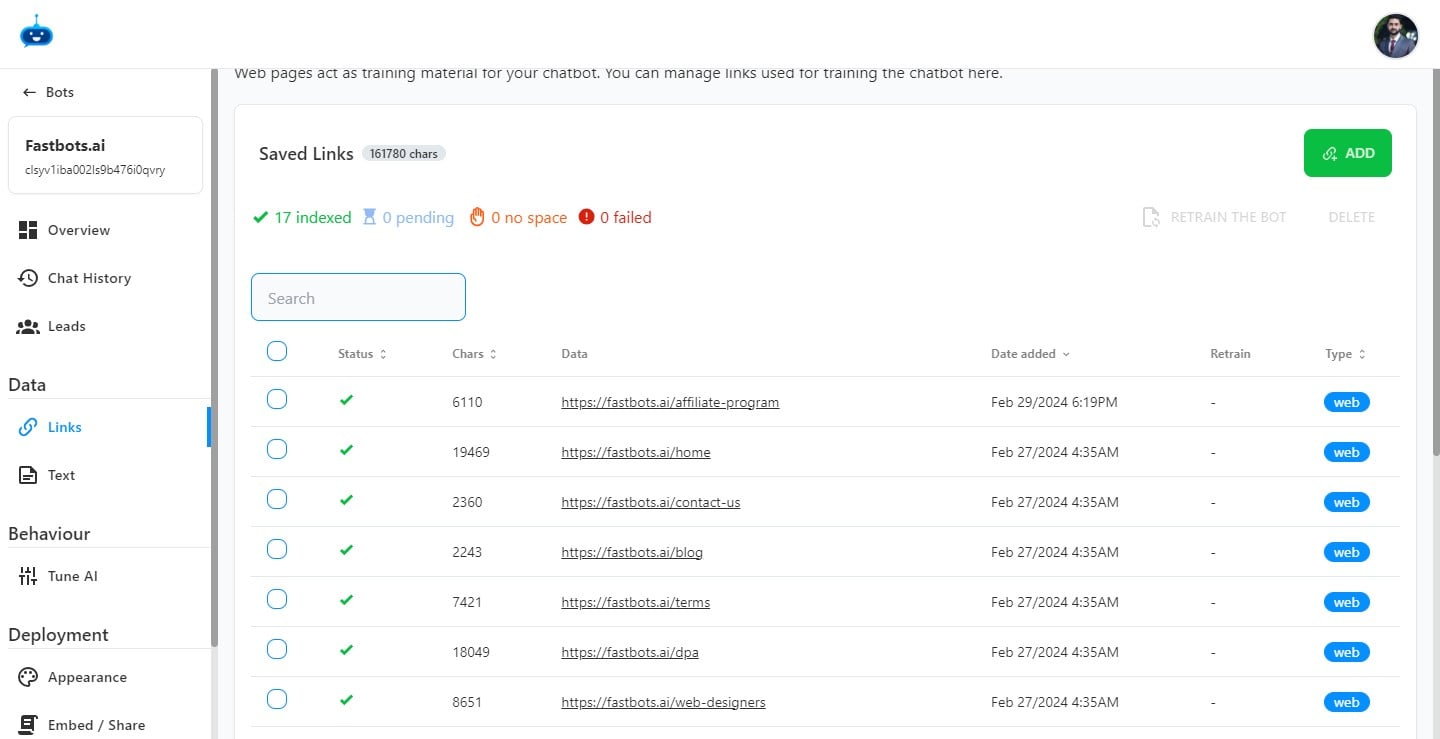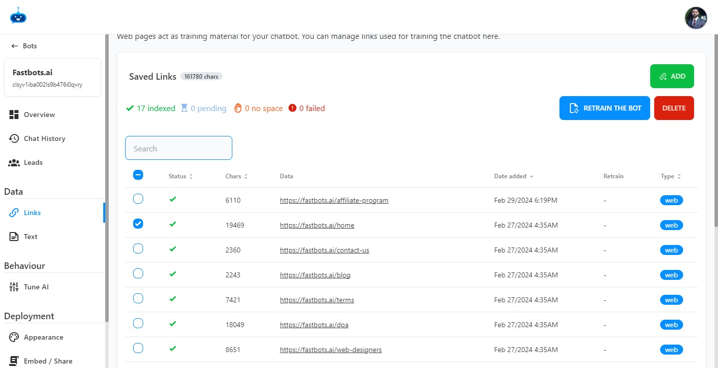 Select the URL for which you want to retrain the chatbot by click on the "Checkbox"